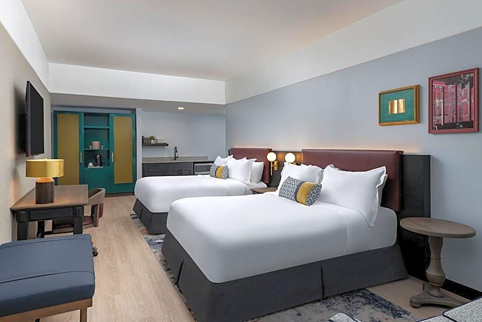Room options span from Standard with two Queen beds (301 sqft) to larger configurations like Standard Corner with a King (334 sqft), plus Suites and Executive layouts. Some configurations pair two Queens with a sofa bed for extra flexibility, catering to solo travelers, couples, or families.